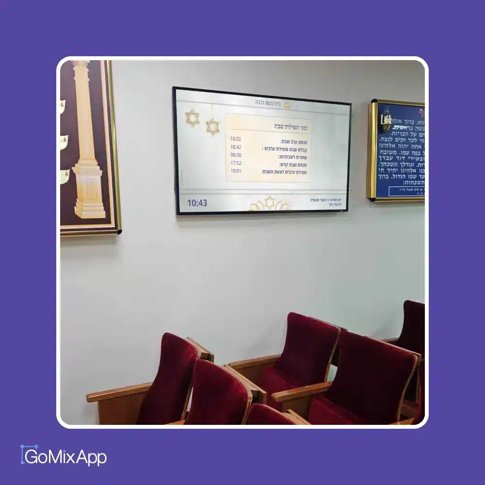 לוח תצוגה דיגיטלי לבית כנסת מותאם אישית. שילוט דיגיטלי עם סטרימר מקצועי לשימוש רציף וללא תקלות. אפשרות לשליטה מרחוק בעדכון התכנים מכל מקום ובכל זמן.